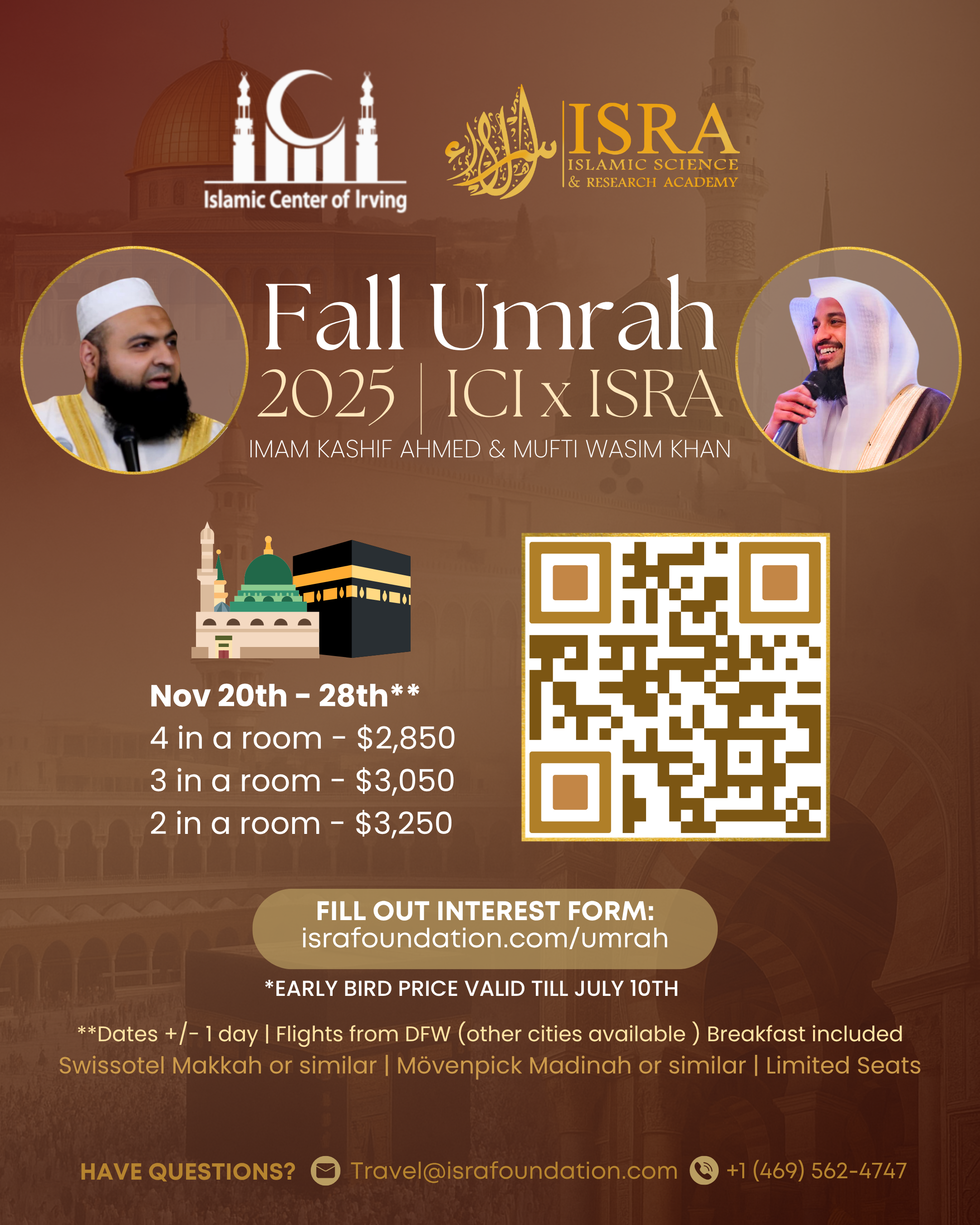 Land and Air - Package A: Umrah: 4 in a room - $2,850 | 3 in a room - $3,050 | 2 in a room - $3,250
